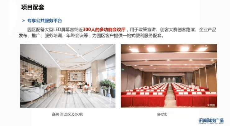 园区配备大型LED屏幕容纳近300人的多功能会议厅,用于政策宣讲、创客大赛创客路演、企业产品发布、推广、服务培训、年终会议等,为园区客户提供一站式便利服务配套。