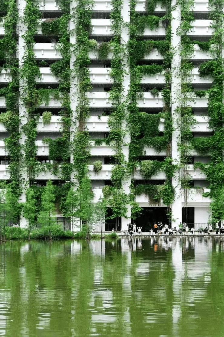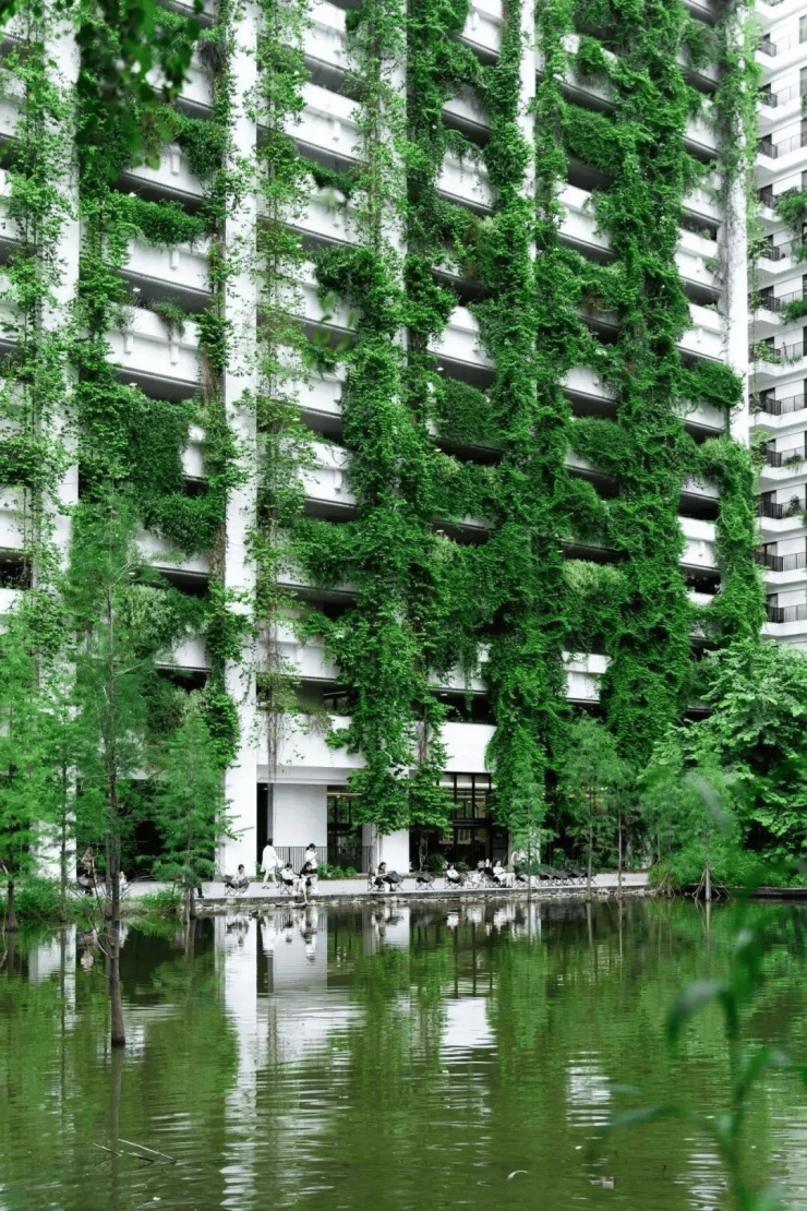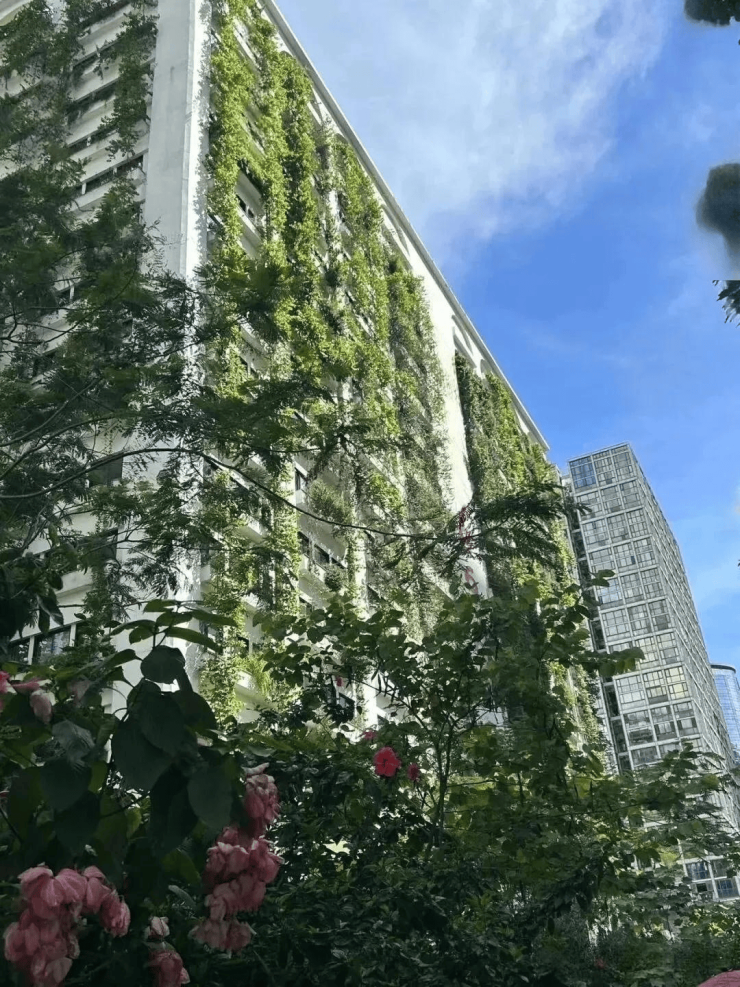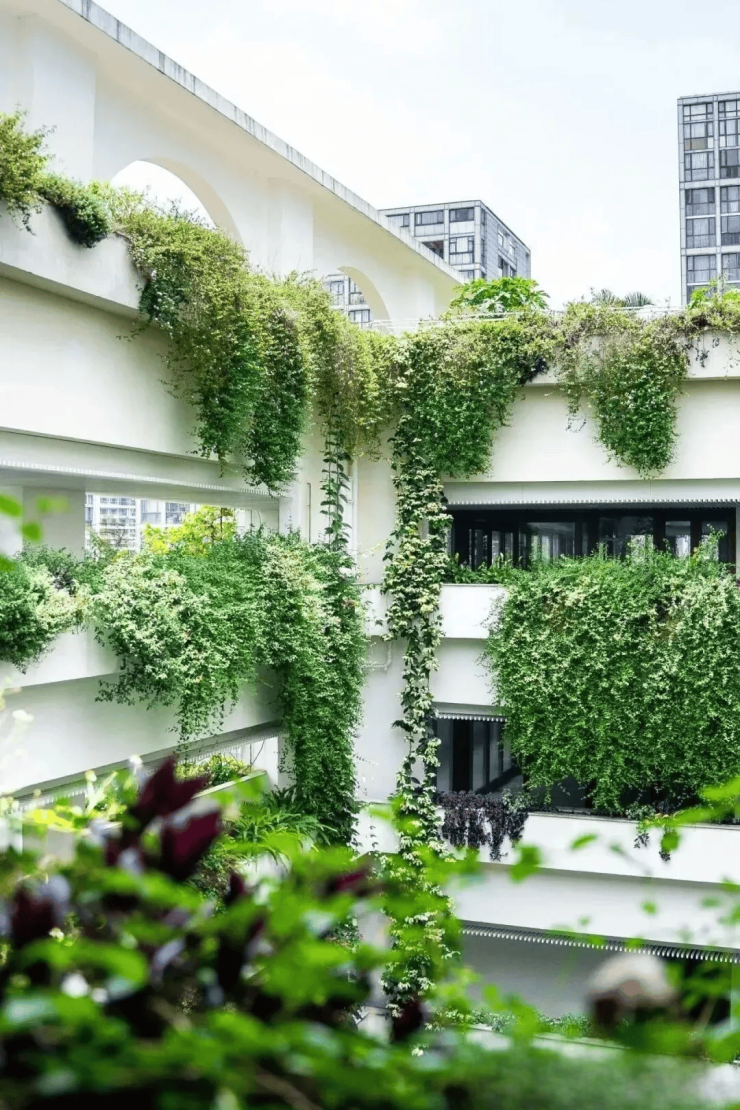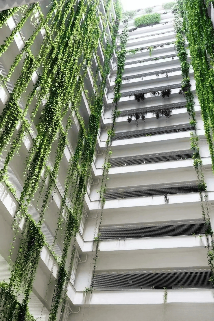 梧桐村的绿,是由外到内的。整座建筑像是一片垂直森林,绿植如瀑布般肆意生长,绿意延伸至每个角落,颇为壮观,是名副其实的“城市绿肺”。