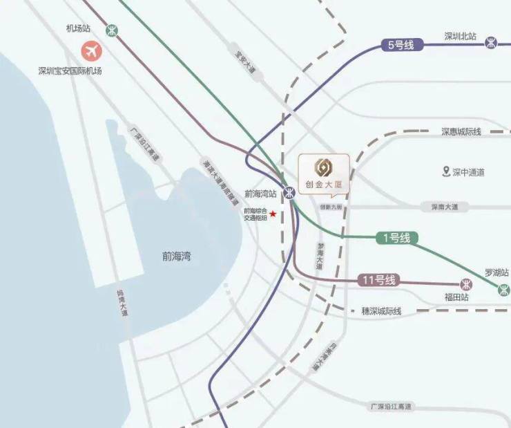 6分钟即可抵达前海湾站三线地铁枢纽,25分钟可接驳深圳宝安国际机场,40分钟可直达深圳北站,深中通道、深惠城际线与穗深城际线环绕布局,全面构建一小时粤港澳大湾区商务出行圈。