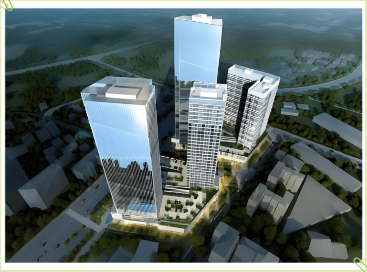 项目总用地面积3.2万平方米,总建筑面积约29.5万平方米,由两栋150米高甲级写字楼、一栋150米高LOFT公寓和两栋100米高商务公寓组成,标准层高4.2米,净高2.95米。中心集商务办公、公寓、酒店、商业于一体,写字楼汇聚创新科技、创意设计、金融投资等领域企业,LOFT公寓采用双层复式结构提供开放艺术空间,商务公寓则为中小企业打造智慧成长平台。