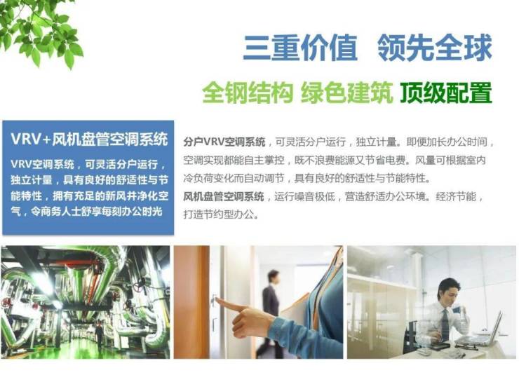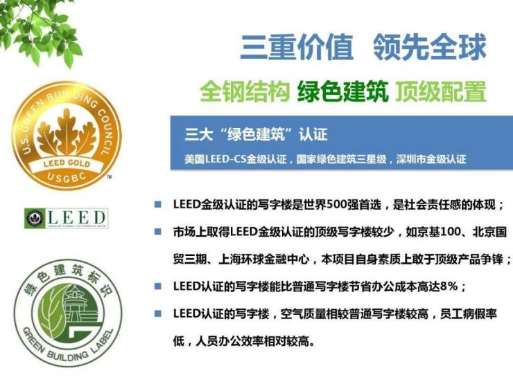 三大“绿色建筑”认证:美国LEED-CS金级认证,国家绿色建筑三星级,深圳市金级认证;