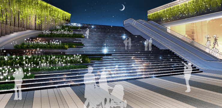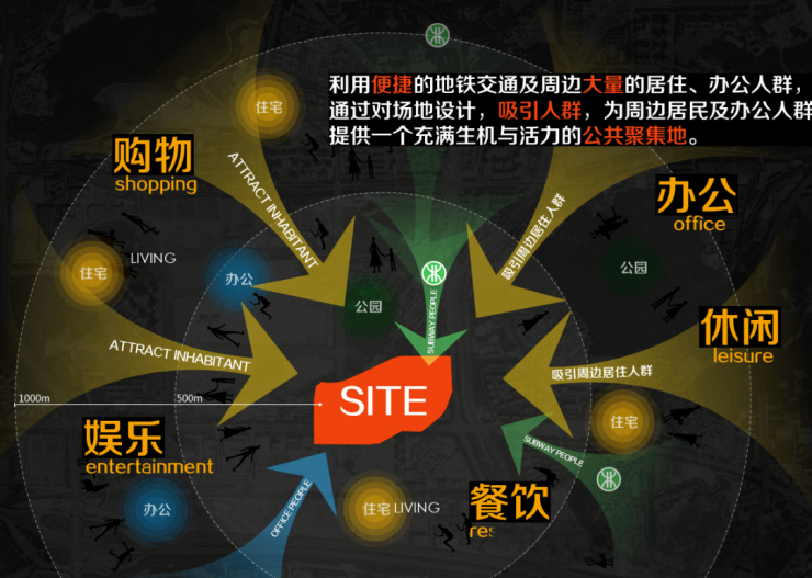 总体平面布局上,项目以“商务花园”式的办公空间为理念来打造,各栋楼环绕生态绿谷分布,采用“一点多板”的形式相组合,通过二楼平台将各栋塔楼连为一个整体,在东北角和西北角设置两个主入口,通过中间的“沙河绿谷”相串联,形成一个景观轴线。