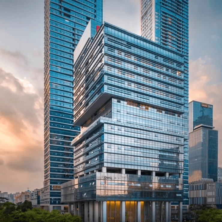 位于后海总部基地片区,占地4144平方米,楼高100米,地下5层,地上21层。