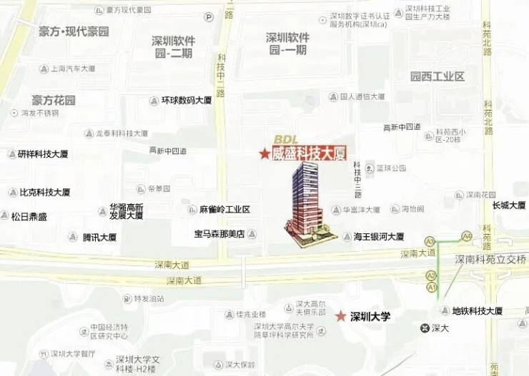 项目属甲A级别写字楼,位于南山科技园,总层数为30层,位于深南大道西侧,深大北门正对面,地铁口(罗宝线深大站A3)上物业,毗邻深大三大主干道:南海大道、科苑大道以及深南大道。