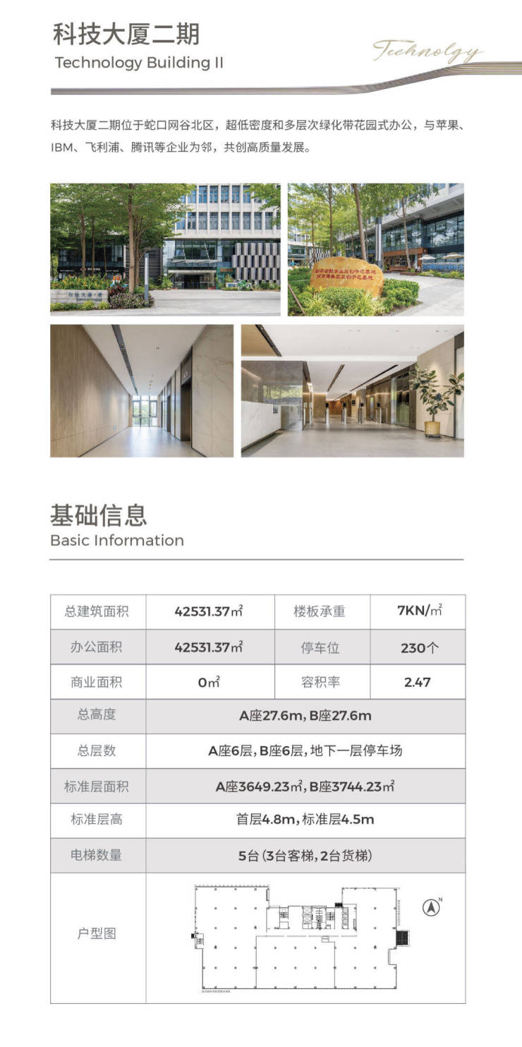 低密园区规划,绿化充足,西靠大南山、南朝蛇口港,景观优越;专业物业管理,24小时安保,电梯配置合理,高峰候梯不拥堵,办公体验流畅舒适。