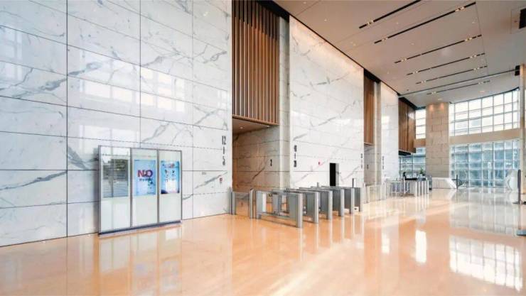 项目采用12米挑高双大堂设计,整体采光通透明亮,空间更显从容。地面铺设高档大理石,细节精工细作,彰显企业非凡的商务气度,营造顶级的奢阔办公体验和国际化的商务仪式感。
