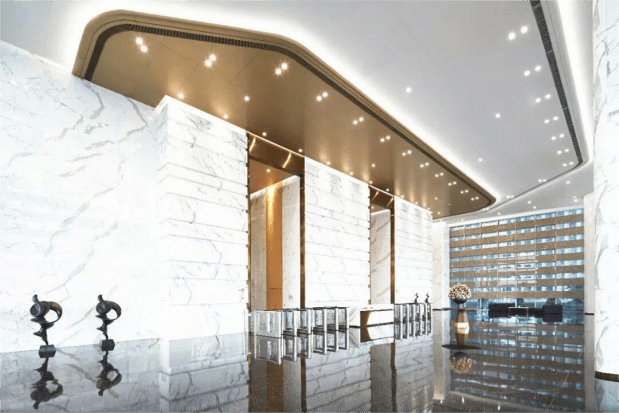项目甄选意大利雪花白大理石等高端进口建材,构筑国际化办公空间体验,充分彰显入驻企业的恢弘品牌形象
