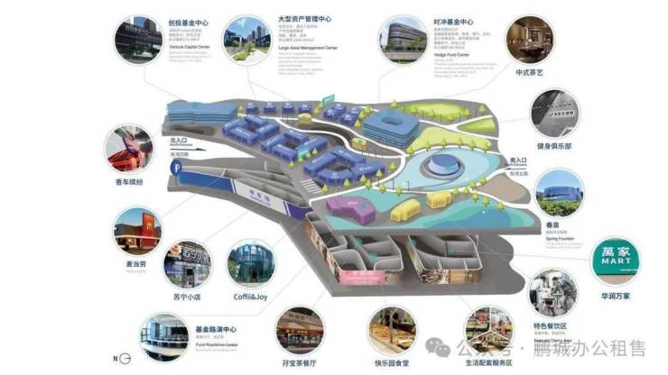 入驻机构含公募/私募基金、银行、证券等,形成资管规模超5000亿的产业集群;配套基金路演中心(10间智能会议室)及投融资对接平台