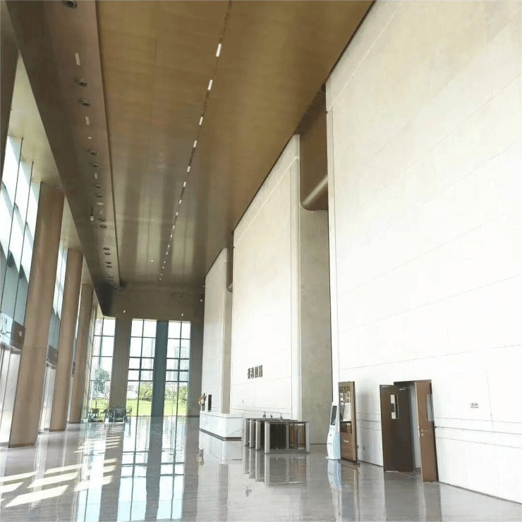 ⾸层⼤堂层⾼约16⽶,匹配知名企业品牌形象与气质格局,尽显庄重恢宏。公共区域天花板采用古铜色不锈钢材质打造,设计元素蕴含鸿运昌盛的美好寓意,视觉效果庄重典雅。